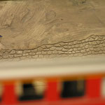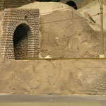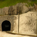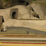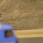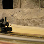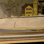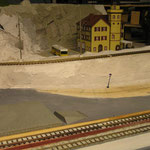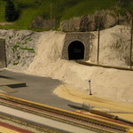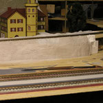 Hinter dem Bahnhof Susch verläuft die ansteigende Strecke in Richtung Davos Platz. Die Streckenführung erfordert hier ein Stützmauer.